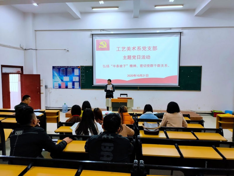 (通讯员 邱雨晨)2020年10月21日下午15:20,工艺美术系党支部在教学楼111教室开展弘扬“半条被子”精神,密切党群干群关系的主题党日活动。活动由支部书记彭长江主持,全体教职工参加。