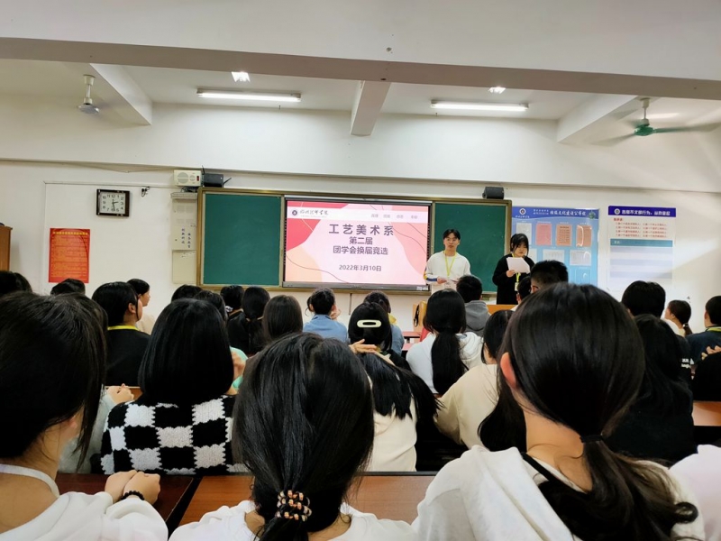 (通讯员 王媛珠)2022年3月10日,工艺美术系团学干部换届竞选会议在教学楼611教室召开。此次换届竞选由工艺美术系主任陆卫、党支部书记彭长江、副主任李卫、陈艳红,系团总支书记王媛珠、系团总支副书记谷财霞担任评委,系全体团学干部参加了此次活动。